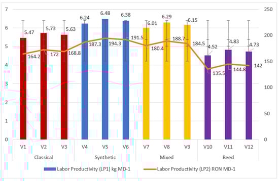 Thus, 12 technology sheets (part 1—technical part A (Table A1) and B (Table A2)—and part 2—economic part (Table A3)—have been prepared, each one drawing up a general estimate of works and direct and production costs for each experimental variant, calculating the live labor requirement (dm/sqm), its cost, mechanical labor costs, material requirements and cost.
