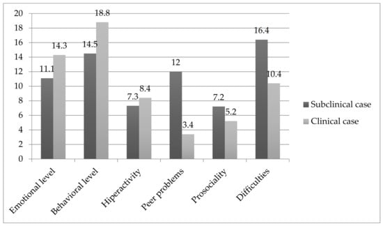 Percentage of subclinical and clinical cases in the 5 subscales and difficulties. Source: Own elaboration.