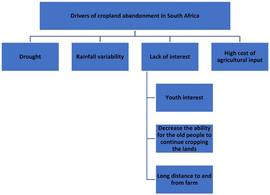 The most decisive drivers of cropland abandonment in South Africa are drought, rainfall variability, and lack of interest in farming by youths [12] coupled with the decreased ability of old people to continue cropping the lands [6] (Figure 1). The long distance between fields and homesteads discourages cultivation by old people since access to the fields is mainly through walking. Old people will find it difficult to walk long distances and, on their arrival, will be engaged in the physical work in the fields. Furthermore, the high possibilities of unmanaged livestock destroying crops in poorly fenced fields deter cropping in communal areas [14]. Furthermore, investment in farming equipment and inputs versus returns is considered unfavourable hence the cessation of cropping [14]. The migration of males to mines for employment purposes also contributed to a decline in cropping [30]. The negative relationship between poor financial revenue and cessation of cropping was also observed in the Mediterranean Basin [31].