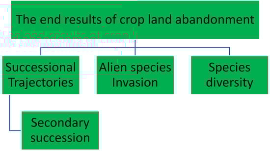 Several years of cultivation alter both chemical and physical properties of soil which directly influence the current vegetation species abundance [88]. Soil chemical properties have been observed to significantly influence plant species composition in old fields [89]. Both physical and chemical properties of soil affect the germination and growth of plants. Secondary succession is disturbed by soil chemistry after abandonment. Soil properties change, as vegetation is also changing, with time after cessation of cultivation. Limited effect of soil was observed at the early stages of succession. Heavy use of fertilisers in cropping results in relatively higher residual levels of nitrogen and phosphorus in young, abandoned cropping lands and they promote the growth of fast-growing, early-successional, alien invasive species [90,91], annual forbs, and grasses relative to perennials [92]. High electrical conductivity and low pH in young, abandoned fields inhibited native plant species and promoted undesirable invasive species and weedy plants [93,94].