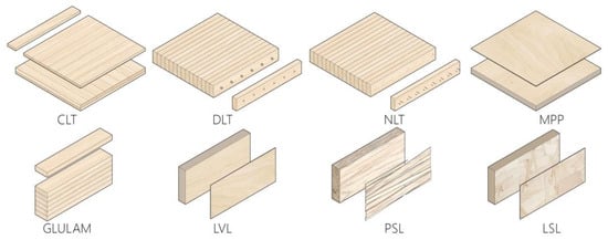 The definition of mass timber is still open to debate. In the 2018 Manual of Multistory Timber Construction, construction timber was divided into solid wood products and wood-based materials [18]. In the 2021 international mass timber report, several distinct mass timber products were included in the category. Many people confuse Engineered Wood Products (EWPs) with mass timber, when in fact mass timber is a distinct class of EWPs. This paper argues that mass timbers belong to engineered wood products, which are building structural materials produced by finger-joint, gluing, pressing, etc., commonly including Cross Laminated Timber (CLT), Dowel Laminated Timber (DLT), Nail Laminated Timber (NLT), Mass Ply Panel (MPP), and other panel structural materials suitable for roofing and floors, also including Glued Laminated Timber (GLULAM), Laminated Veneer Lumber (LVL), Parallel Strand Lumber (PSL), Laminated Strand Lumber (LSL), and other structural materials suitable for beams and columns (Figure 1). Among them, CLT is composed of three or more layers of small-sized sawn timber or wood-based materials, which are pressed and glued in an orthogonal arrangement. It is one of the most promising mass timbers, which has a long refractory time, high strength-to-weight ratio, and is widely used [19].