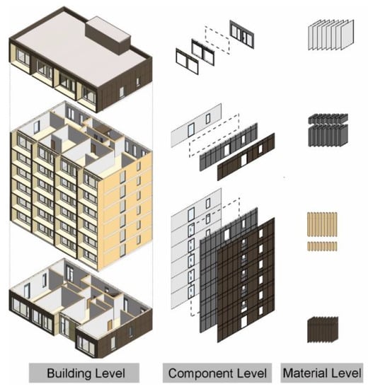 The RP of components is affected by the composition of components and the ease of material separation. Felix Heisel described the process of documenting materials and products utilized in the construction of the Urban Mining and Recycling unit within the Madaster platform. He explored the method of assessing the potential of circularity indicators, the process of which involves the building material/product level and the building element level [26]. Gaochuang Cai et al. proposed a material and component bank to manage more effectively the recycling of materials and direct reuse of components, which combined with the current building information modeling, design for deconstruction, supply chain, and LCA [29]. Lukman A. Akanbi et al. developed a disassembly and deconstruction analytics system, which would ensure that buildings are designed with DFD principles that guarantee efficient materials recovery in mind [30]. D Schwede et al. developed a scientific method for analyzing recyclability in detail that takes joining techniques into account. The ILEK RecyclingGraph Editor described structural element in recycling graphs whose components represent their material elements and connections. To identify the best form of recycling, materials are each classified on a five-level scale based on a system developed by the Austrian Institute for Healthy and Ecological Building [31].