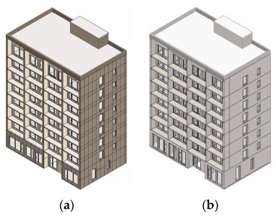 Variant RC is an RC shear wall structure building that mainly refers to China’s low-energy building design code in cold regions (JGJ 26-2018). The loadbearing parts are made out of reinforced concrete. The structural material of the infill wall is hollow concrete blocks. The construction practices of building exterior walls, floor slabs, and roofs all refer to the common practices in architectural design methods in cold regions of China. Most insulation materials are EPS, and the finishing material is plaster (Figure 3b).