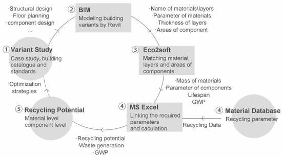 For the RP of buildings, so far, building certification systems tend to rate recycling aspects mostly in terms of quality, especially those related to the environmental impact of material recycling in the end of life stages of LCA [32]. In recent years, the research on material recycling in the early stage of building design has a raised trend. Thormark expressed the RP of a building as the amount of embodied energy and natural resources used in a building that could be made usable through recycling after demolition. Results show that the embodied energy was 40% of the total energy of the building, which can be approximately decreased by about 17% and increased by 6% through the substitution of different materials [9]. In another study, Thormark estimated the energy usage from a building life cycle and concluded that about 37–42% of the embodied energy used in buildings can be recovered using recycling. Additionally, the RP was found to be approximately 15% of the total energy associated with the building’s lifetime [8]. Blengini examined the RP of a residential building in Turin, whereby the RP was assessed by 29%, considering the materials embodied in the building shell [10]. Takano et al. have carried out a study to analyze the influence of materials selection on life-cycle energy balance using a case study. It was discussed that selection materials for surface and inner components have a larger effect than others, and the recycling benefits of woods and plastics have large effects on the building’s life-cycle energy balance. Condeixa et al. carried out a Material Flow Analysis for the building stock of Rio de Janeiro, where they estimated the building age and the remaining lifetime in order to make assumptions for environmental impact assessments and planning strategies for efficient use of materials [33]. Meliha Honic et al. coupled building catalogues and eco-repositories to digital design tools to evaluate the RP and environmental impact of buildings, and the results are based on element-level calculation, whereby a representative exterior wall is presented. They used the recycling weight parameter in the Eco2soft tool to assess the shares of recycling and waste of material. Results show that RP of the concrete variant is better but leads to more waste, while the variant in timber has a significantly lower impact on the environment [14]. Catherine De Wolf et al. have compared existing methodologies to quantify the global warming potential (GWP) of recycled/recyclable and reused/reusable products. They show that current quantification methods do not address the full spectrum of the reuse practice due to their limited boundaries, and that a number of critical features are currently hardly quantifiable [34]. Furthermore, in the field of building environmental impact assessment, studies considering the integration of building information modeling (BIM) and LCA are increasing. Assima Dauletbek et al. considered the feasibility of using a method of BIM-enabled LCA for the refurbishment in terms of environmental compatibility, energy efficiency, and profitability. The results demonstrate the feasibility of quantitative evaluation of building parameters using the BIM-LCA tool [35]. Baoquan Cheng et al. proposed a building life cycle embodied environmental impacts evaluation approach by integrating BIM and LCA taking a reinforced concrete structure building as a demonstrator. The results showed that the material production stage is the most crucial stage to improve a building’s environmental performance [36].