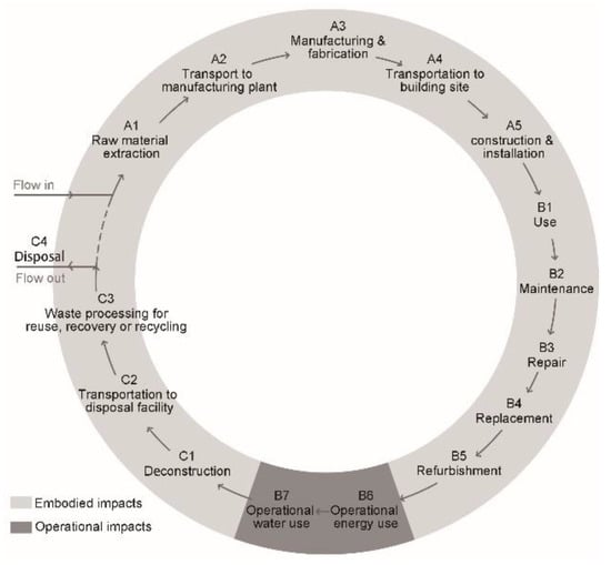 Eco2soft is an LCA tool utilized to carry out basic LCAs for building elements or buildings and considers the three indicators GWP, AP, and PEI. [37]. The goal of this LCA is to introduce LCA as a tool to obtain parameters related to building-level RP calculations (mass at 0 year, mass at 100-year, mass of components, etc.), while obtaining the GWP related to production, transportation, replacement, and recycling in the building life cycle. Specifically, for this case study, the goal of this LCA is to evaluate the environmental impacts of a timber building and a functionally equivalent conventional concrete building in China. Both buildings are 8-story residential buildings with 100-year service life. The functional unit in this study was 1 m2 of floor area. As the focus of this study is on resource efficiency, only embodied impacts were evaluated. The system boundary for this assessment was cradle to grave and included several modules: A1, raw material extraction; A2, transportation of materials to manufacturing plant; A3, manufacturing and fabrication; A4, transportation to building site; B4, replacement; and C3, waste processing for reuse, recovery, or recycling (Figure 5). The operational impacts were not considered. In order to ensure the comparability of the two variants in terms of embedded impacts, we kept the U-values of all components in the two variants consistent. The data required for the calculation were mainly from the building material benchmarks database in Eco2soft, and the default values in China’s standard for building carbon emission calculation (GB/T 51366-2019). Compared with other LCA software, Eco2soft (The software version number: Eco2soft 2022: https://www.baubook.at/eco2soft/?SW=27&lng=2, accessed on 26 April 2022; https://www.baubook.at/eco2soft/?SW=27&lng=2, accessed on 26 April 2022; IBO—Österreichisches Institut für Bauen und Ökologie GmbH, Wien, Austria) is a designer-friendly LCA software. It simplifies the iterative calculation process, and can directly generate LCA results through simple parameter settings, which is very suitable for fast calculation and comparison of GWP values of buildings in the early stage of architectural design. In Eco2soft, it is possible to create multi-layered elements, for example, an outside wall with a facade, a loadbearing layer, and an insulation layer, and set its parameters such as total area, material manufacturer, material life, and so on. Then the user can select the catalog of LCA indicators, service life, study period, disposal indicator, transportation method, transportation distance, recycling method, etc. in the software, and the results of the LCA can be generated. Therefore, according to the material composition, material layer thickness and member area information obtained from the BIM model. We entered the information of exterior/interior walls, roof, ceilings, and stairs in Eco2soft, and set the service life information of building materials according to the material database that comes with the software. After calculation, data such as mass, bulk density, and life cycle carbon emissions of materials, components, and buildings can be obtained.