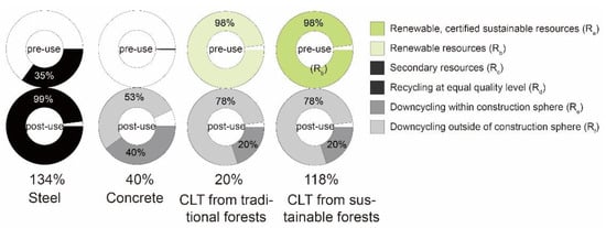 A comparison of material-level RP is between the load-bearing material of Variant CLT and Variant RC (CLT, concrete, and steel). For CLT made from sustainable forests (Figure 6), its glue content is about 1%–3%, and about 98% of the resources before use are renewable resources wood, so the renewable resources before use can reach 98%. After use, about 20% of the CLT can be downgraded and reused to produce building materials such as particleboard and high-density fiberboard, and the rest can be used for incineration power generation treatment (downgraded and reused outside the construction field). Therefore, the final RP of CLT made from sustainable forests is 118% (98% + 20%), which can form a closed-loop material flow. However, for CLT used for structural support materials, the final RP is 20% if the wood is not sustainably certified prior to use. For concrete, it is mainly composed of non-renewable resources such as sand and cement. After use, on average about 40% of the concrete can be used for downgrading and reuse in the construction field such as recycled aggregate and foundation cushion, so the final RP is 40% and a closed-loop material flow cannot be formed. For steel, about 35% of the resources before use are secondary resources, and about 99% of the steel can be reused at the same level after use, so its RP reaches 134% (35% + 99%), forming a closed-loop material flow.