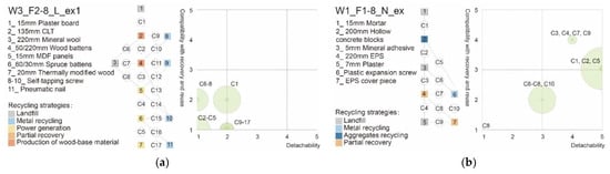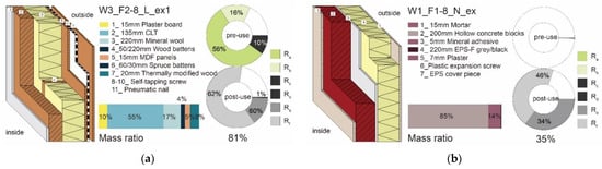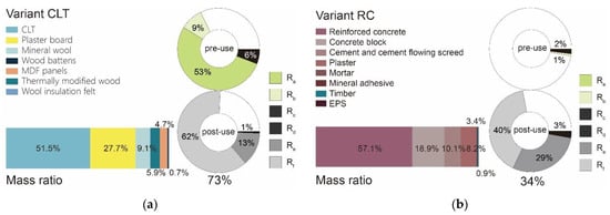 Under the premise of disassembly, the RP of components is composed of the proportion of renewable resources and secondary resources that have been certified as sustainable before use and the proportion of resources that can continue to be used in the construction field after use, namely the mass weighting of the material cycle parameters for each build layer (Equation (3)). The product of the cycle parameter of a material and its mass fraction is defined as the recycling potential contribution of that material. Furthermore, the components such as self-tapping screws, expansion screws, and other connectors, as well as waterproof membranes and breathable membranes, account for a relatively low mass and are not included in the calculation of RP. In order to clarify the quality of waste, the resources that cannot be recycled are regarded as waste. Meanwhile, the detachability of a component is calculated with the ILEK RecyclingGraph.