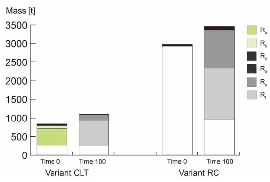 Compared with the variant RC exterior wall components with the same thermal conductivity (Table 2), the RP of concrete components is 35%, and the proportion of concrete mass is high (85.4%), which plays a decisive role in the RP calculation. Among other materials, cement-based materials are used for exterior finishes, bonding, and interior finishes. If the 100-year service life is considered, the mass proportion of this type of material will reach about 30%. Therefore, concrete and various plasters show the highest need for optimization. It hardly contains any secondary or renewable resources in the pre-use stage. After the components are used, they are mainly used for downgrading outside the construction field (46%), and the proportion of waste (20%) is slightly lower than that of mass timber building components (22%). However, the total mass of concrete components is large, and the total amount of waste generated per square meter of elements (≈66 kg/m2) is more than twice that of mass timber elements (≈26 kg/m2).