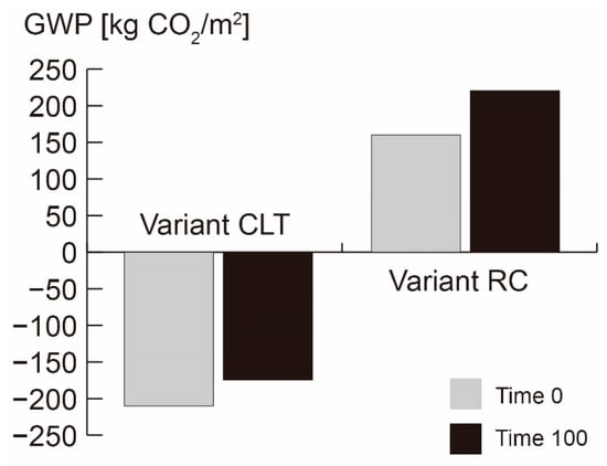 When we compare the GWP results (Figure 11), it is obvious that the Variant CLT has a lower environmental impact than Variant RC. The GWP even has a negative value in Variant CLT, which is −174.0 kgCO2/m2, and Variant RC has a GWP of 221.0 kgCO2/m2.