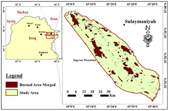 Location of the study area in the southern part of the Sulaymaniyah governate in the Kurdistan Region of Iraq. The total burned area mapped is shown for the entire region.