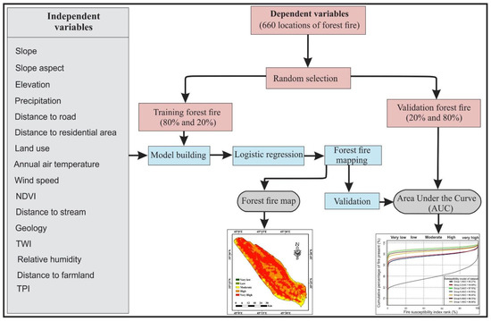 Fire events, caused by natural or anthropogenic factors, are a major threat to landscape resources, so they must be controlled and prevented. To minimize this threat to forests, managers should be fully knowledgeable about past fire processes. Accordingly, spatial analysis of fires must be performed in every region, and conservation strategies should be formulated for every region, after a thorough understanding of temporal–spatial processes. The prerequisite for such endeavor is the ability to make predictions, perform spatial analyses, and prepare a fire susceptibility map. The use of the logistic regression method is one of the risk-modeling methods, which helps to determine the relationship between independent and dependent variables. Additionally, combining remote sensing data with geographic information data and statistical models permits fire managers and personnel to predict ‘where and when’ vegetation fires will occur.