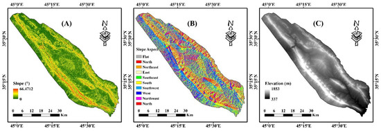 In addition, the Digital Elevation Model (DEM) of the Shuttle Radar Topography Mission (STRM), with 1 arc-second resolution, was employed to derive slope, slope aspect, elevation, TWI, and TPI maps. The TWI and TPI are defined, based on Equation (2) [64] and Equation (3) [65], respectively:
