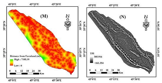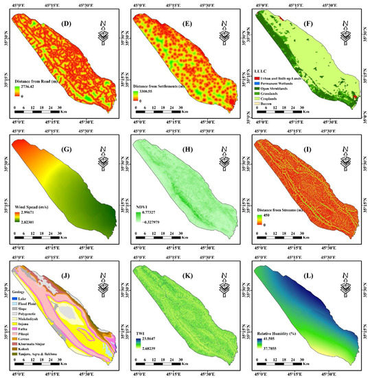 Moreover, GIS world imagery was used to create the road, settlements, and farmlands maps, to extract the maps of distance from roads, distance from settlements, and distance from farmlands. More details of the datasets used and their specifications are fully described and presented in Table 2. Figure 3 and Figure 4 show the 16 predictive factors, which were used in this study.