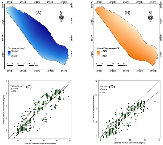 Meteorological parameter maps: (A) annual precipitation (from 1998 to 2017); (B) annual temperature (from 1979 to 2014); (C,D) coefficient of determination maximum and minimum temperature, respectively.
