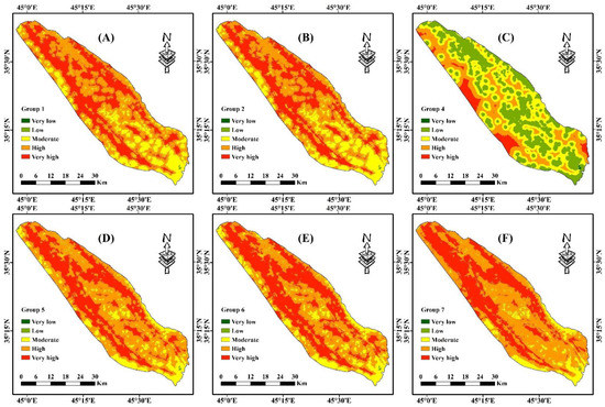 After preparing all the factors required and determining the geographical locations of the fires, which took place during the six years within the study area, logistic regression was utilized to determine the relationship between factors affecting fire occurrence and the related spatial modeling. The logistic regression relationship was established between fire occurrences, as dependent variables, and the mentioned parameters, as independent variables. Since the studied factors were selected from the literature review, the regression model was repeated seven times, once to validate the dataset and once, again, to train the dataset to examine the importance of selecting these factors (Appendix C and Appendix D). The p-values for all predictor factors used in all models are less than 0.05. Therefore, they have a statistically significant relationship with the fire occurrence in all models. In group 1, we selected those factors that were used in less than 20% of the studies in various regions, which were entered into the regression. In group 2, geology was omitted. Besides, TPI, TWI, and the distance from agricultural lands were removed in groups 3, 4, and 5, respectively. In group 6, relative humidity was omitted, and, finally, all respective factors were entered into the logistic regression in group 7 (Appendix C and Appendix D). As a result, seven zoning maps of fire susceptible areas were prepared. The importance of the order of the factors, based on the coefficients achieved in each of the seven cases, is according to the order of the following diagrams, with the maps indicating seven zoning times (Figure 5 and Figure 6).