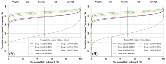 Figure 7 shows the validation results for the fire potential map. This diagram shows that the success rate in all groups is quite apt, ranging from 84.85 to 97.68%. Among all groups, group 3, i.e., the group with TPI excluded from the model calculations, has the highest stability and success rates (AUC), which are 97.30% and 97.31% for both 20% and 80%, as training dataset evaluations, respectively (Figure 7). In addition, when assessing the 20% as a training dataset, group 7 had the highest accuracy (97.68%), compared to the findings of the other groups (Figure 7A), and it came in second place (96.72%) in terms of accuracy, when evaluating the 80% as a validation dataset (Figure 7B), which means less stability than that of group 3.
