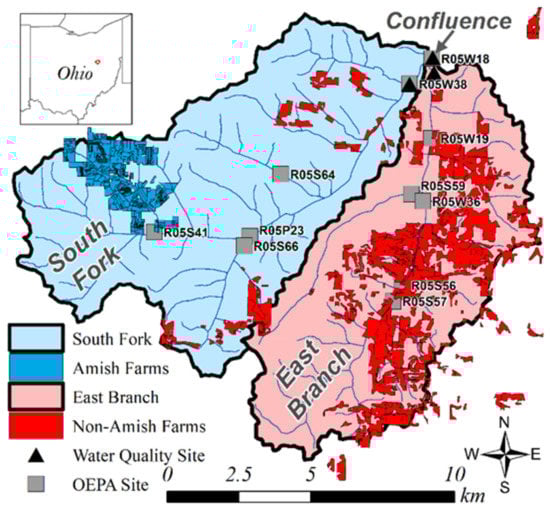 The Amish are a traditional agrarian Christian subculture that originated in Switzerland and Alsace in 1693 as an off-shoot of the Anabaptist branch of the Protestant Reformation [16,17]. Today, they can no longer be found in Europe. The North American Amish, located primarily in the states of Ohio, Pennsylvania, Iowa, and Indiana, preserve much of their Germanic heritage in a language that is an oral folk German dialect [18,19]. They have maintained a highly interconnected social system of cooperative, mutualistic, and unifying interactions which sustains them as a separate subculture. The primary unit of Amish society is a patriarchal family [20,21]. Groups of families are tightly connected as parts of an Amish church community or Gemeinde (a redemptive community [22], in which personal salvation takes place in the Christian community) who rotate for biweekly worship in each other’s homes and barns [18]. Each church community has its own lay church leaders and a set of socio–religious rules called the Ordnung, which create boundaries between them and the world and limit the scale of many aspects of their culture, including technology and farm operation [18,23,24]. For example, to encourage a slower pace of life and more local connectedness, Ordnungs do not allow church members to own automobiles; horses and buggies are used instead [18]. Furthermore, only horses are allowed to be the main source of power in agricultural field work so farm size is limited to what a family with a team of draft horses can manage (20–60 ha) [17,19,20]. There are also several small Amish parochial schools with education ending after the 8th grade. Cooperative labor in the form of oat threshing rings and corn silo filling rings is neighborhood-based and crisscrosses church boundaries. The Amish do not participate in USDA Farm Bill conservation programs, but a number of the Amish of the South Fork participated in the Alpine Nutrient Trading Plan which paid farmers for installing manure storage facilities and milk house waste underground storage tanks that are pumped out onto the fields. The South Fork Amish also installed conservation management practices on their dairy farms from several Ohio Environmental Protection Agency (OEPA) 319 grants, such as fencing cows out of streams. In 2016, the OEPA awarded Holmes County Soil and Water Conservation District a grant to eliminate manure and dairy parlor waste and improve or install heavy-use pads and access lanes, dairy cow exclusion fencing from streams, and alternate water sourcing to keep cows out of the streams.