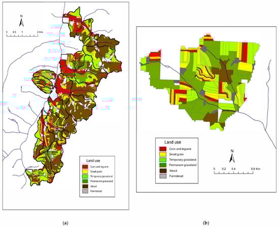 - The land management through crop and animal management, where we focused on: (1) crop rotations and their spatial organization over the fields of the farm. For that, we utilized the methodologies described by Maxime et al. (1995) and Morlon and Benoit (1990) [32,33], which have already been explained and used in combination by Joannon et al. (2006) [34]; (2) animal feeding, as it has a direct impact on land management and explains partly the land use of the farm.