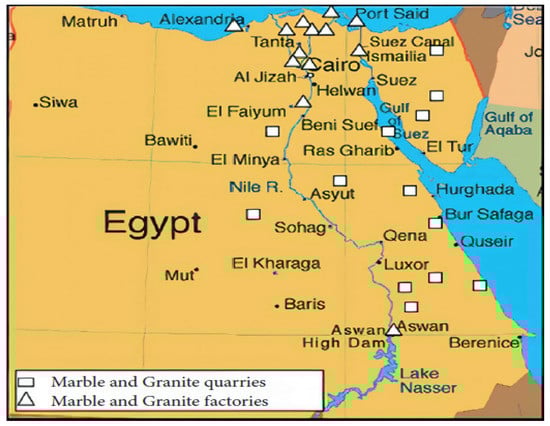 Egypt produces over 50 different kinds of marble and granite, and ranks as the seventh country in the world in terms of volume after China, India, Italy, Spain, Turkey, and Brazil []. Figure 1 shows the marble and granite quarries and factories found in different locations all over the country []. After mining in the quarries, processing operations, such as sawing and polishing, are performed for the preparation of tiles and slabs for use in decorative purposes [].