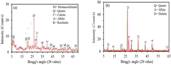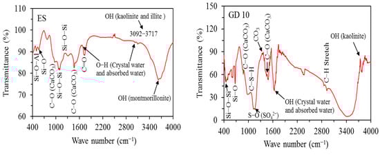 The ES sample used in the present work is obtained from the village of El-Salheya, Qena, Egypt (latitude 26°07′11″ N and longitude 32°54′17″ E). The soil is collected by the open excavation method from a depth of 2.5 m below the ground surface. The particle size distribution of ES shows 37.12% clay, 59.88% silt, and 3% sand, as shown in Table 1. The liquid limit was 51.94% and its plasticity index was equal to 21.44%. The compaction characteristics show that the MDU and OMC are 18.05 kN/m3 and 15.80%, respectively. The XRD of the ES, as shown in Figure 2a, confirmed the presence of montmorillonite and quartz. The microstructural examination (Figure 3a) of ES illustrates the presence of several void spaces between particles, whereas the EDAX analysis shows the presence of a predominant amount of aluminium (Al) and silica (Si), with a small amount of magnesium (Mg) and calcium (Ca) (Figure 3b). The FTIR spectrum of the ES in the infrared region (IR) (400 to 4000 cm−1) is presented in Figure 4a. The hydroxyl group of montmorillonites have been observed in the IR band of 3616 cm−1. The band at 1634 cm−1 is assigned to the OH− deformation mode of water. A peak near 1007 cm−1 is assigned to Si-O stretching, which confirms the existence of some kaolinite. Furthermore, the presence of quartz was indicated by the peaks at 433, 512, 785, and 1100 cm−1. The assignments were performed according to the published literature [,,,,].