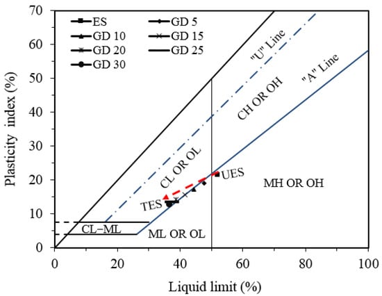 To demonstrate the influence of GD content on the plasticity characteristics of ES, Atterberg’s limits, that is, liquid limit (LL), plastic limit (PL), and plasticity index (PI), were determined. Figure 5 depicts the test results for ES and TES.