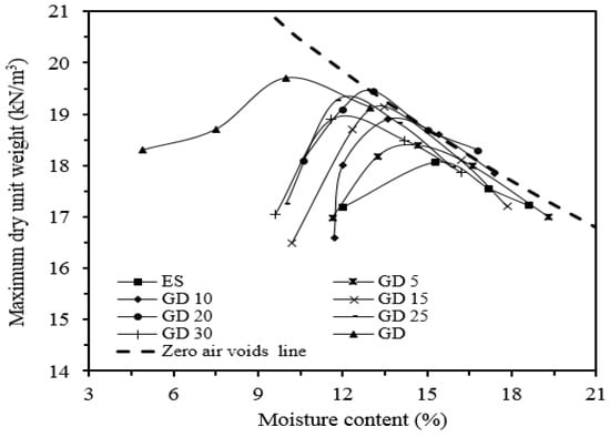 Figure 9 shows a relation between OMC and the additional content of GD to the ES. The OMC value for the ES was 15.8%. As the percentage of GD increased from 0 to 30%, the OMC was gradually decreased to 12%. This reduction is due to the replacement of the fine particles in the ES with coarse particles of GD, which has a lower ability to absorb water compared to the ES. These results are compatible with studies [,,].