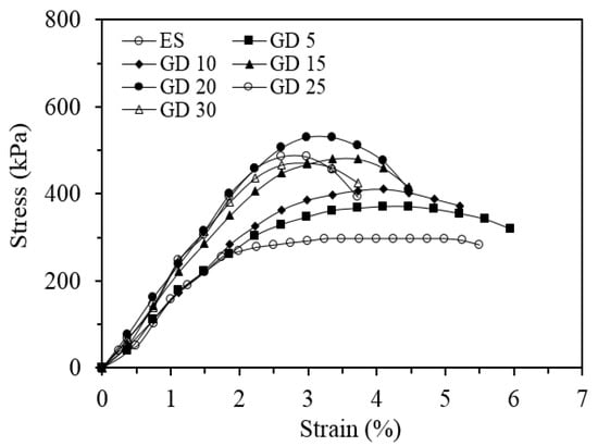 Stress-strain curves at different percentages of GD after a 28 day curing period.