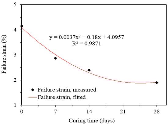 To further study the failure patterns, the variation in the failure strain of soil samples with different curing periods (7, 14, and 28 days) is summarised in Figure 12. With the rise in GD content, the failure strain decreases from 4.15% to 2.87% (7 days), 4.15% to 2.40% (14 days), and 4.15% to 1.90% (28 days), respectively. This is because GD is similar to silty soil and it is non-plastic, thus leading to a reduction of plasticity in stabilized soil. In addition, an investigation of the microstructures of the ES treated with GD using SEM (In addition, adding GD to the untreated ES produces a mixture with a more compact structure than that observed in natural soil, as investigated by Jain et al. [] in a comparison study of microstructures between the untreated ES and the soil with 20% marble dust using SEM analysis. A mixture with a highly compacted structure clearly produces a mixed specimen with a high density, leading in a high stiffness.) showed that a mixture with a highly compacted structure produces a mixed specimen with a high density, leading to high stiffness. This is consistent with the general trends observed in previous studies, such as Ibrahim et al. [], and Blayi et al. []. A regression model has been established to predict failure strain (ε) of the ES mixed with various percentages of GD. The model is as follows: