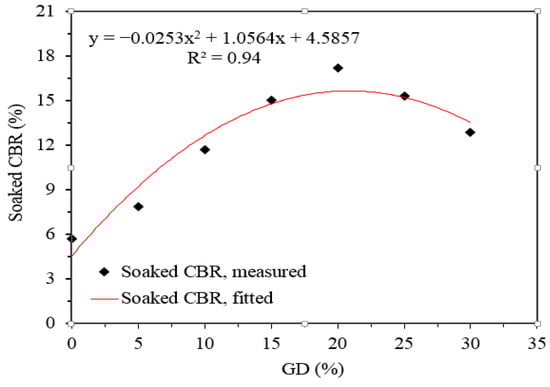 The California bearing ratio test is an essential parameter to measure the subgrade strength of roads, organize sub-base components for elastic pavements, and to establish the thickness of layers of pavement. The soaking CBR tests were conducted out on ES and TES using MDU and OMC cured for 7 days with varying percentages of GD. The results of the tests are depicted in Figure 13. The GD percentages added up to 20% enhanced the CBR values of the specimens but, subsequently, there was a decline, as shown in this figure. For example, the CBR value for expansive soil was 5.70%, but it climbed to 17.3% when 20% GD was used in the sample, before then falling to 15.2% and 12.5%, respectively, when 25% and 30% GD was used. As shown, a 20% increase in CBR value translates to a more than 200% increase, indicating that GD addition has a considerable impact on the CBR performance of the specimens (Figure 13). This is due to GD additions changing the bearing capacity of the entire sample up to 20% GD content by filling voids between ES grains. The reason is also due to an increase in MDU due to the addition of GD content, which resulted in higher CBR and UCS. Igwe and Adepehin [] explained that the cation exchange and agglomeration reactions that occur when rock dust is added to clay soils cause an increase in CBR. Samples with GD beyond transition content, on the other hand, had a CBR value of less than 17.3%, indicating that the GD grains controlled the majority of the overall behaviour. This is because of a reduction in the density of compositions or more solids being occupied in a given volume. A regression model has been established to predict the CBR of the ES mixed with various percentages of GD. The model is as follows: