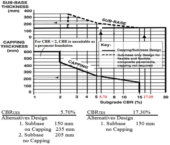 where STT and STU are the sub-base thickness design of treated and untreated ES (mm), respectively.