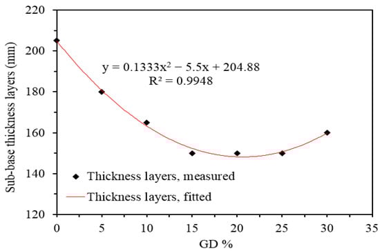 The thickness of sub-base pavement is governed by the CBR value of subgrade soils. Figure 14 presents the sub-base and capping thickness design details. The thickness of the sub-base is 150 mm for a subgrade with a CBR value greater than 15%. Conversely, there are two options for the subgrade with the performance of 2.5–15%; (1) 150 mm thickness of sub-base with various capping thickness, (2) a higher thickness of sub-base without capping []. As a result of the increased CBR values caused by GD, the thickness of the sub-base layer is reduced from 240 to 150 mm (Figure 15). Table 2 tabulates the pavement design alternatives based on the CBR performance of the specimens. Similar findings are provided by Blayi et al. [], Cabalar et al. [], and Ene and Okagbue [], which support the authors’ results in this study. A regression model has been established to predict the sub-base thickness design of the ES mixed with various percentages of GD. The model is as follows: