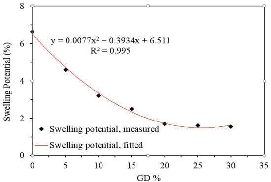 Figure 16 displays the swelling potential as a function of the percentage of GD added to the ES, up to 30%. It is clear that, by increasing the percentages of GD up to 30%, the swelling potential decreases from 6.63% to 1.54%. On the other hand, from Figure 17, it is evident that the rate of decrease in the value of swelling potential is large with the increase in the percentage of GD, and that this rate decreases after increasing this percentage greater than 20%. This behaviour can be explained by the fact that the addition of non-expansive material to the expansive soil reduces the clay-minerals content per unit mass of soil-GD mixes. Consequently, the total surface area of expansive clay particles decreases, and this can cause the values of the swelling percent to diminish. Moreover, this could be due to the GD, which produces a denser packed soil mixture for the pore water pressure, and this pack offers high resistance to swelling. A similar result was observed by various researchers with various stabilizer materials, such as Ogila [], Blayi et al. [], Abdelkader et al. [], and Kalkan et al., []. A regression model has been established to predict the swelling potential of the ES mixed with various percentages of GD. The model is as follows: