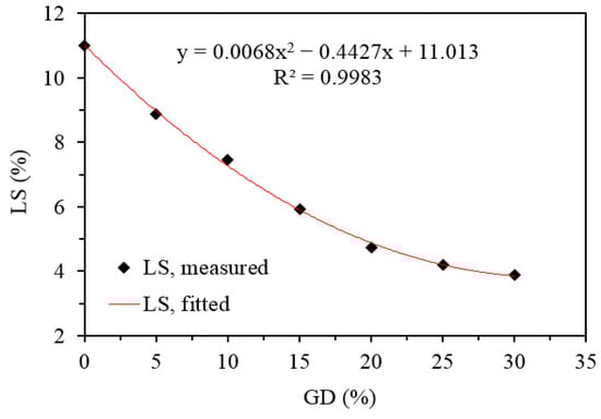 The one-dimensional shrinkage of stabilized ES samples in terms of GD percentage was determined using linear shrinkage (LS) tests. The test trough was filled with a stabilized sample at the LL state. The wet material trough was placed in a drying oven and dried for about 24 h at a temperature of 110 °C until all shrinking had ceased. Digital callipers were used to measure the length of the dry soil specimens, and the values of LS were calculated for the stabilized ES samples. Figure 18 depicts the outcomes of the testing. The LS of stabilized ES samples reduced from 10.80% to 3.9% when the GD was added up to 30% by dry weight of the soil. This means that the GD particles are responsible for this drop in LS value. When GD is mixed with soil, the particle size of the mixed sample increases. As particle size increases, the surface area of the particles decreases. Furthermore, the amount of clay mineral in soils decreases with the increase of GD content in the soil combination. As a result, the water-holding capacity of the soil mixture decreases and, as a result, the LS limit also decreases. These results agree with the results of the study of Blayi et al. [], where LS was reduced from 9.07% to 2.61% with the addition of 24% rock powder to the ES samples. Additionally, the obtained results agree with Igwe and Illoabachie’s [] study, where LS was reduced from 12% to 3.1% with the addition of 20% GD to the clay samples. A regression model has been established to predict the LS of the ES mixed with various percentages of GD. The model is as follows: