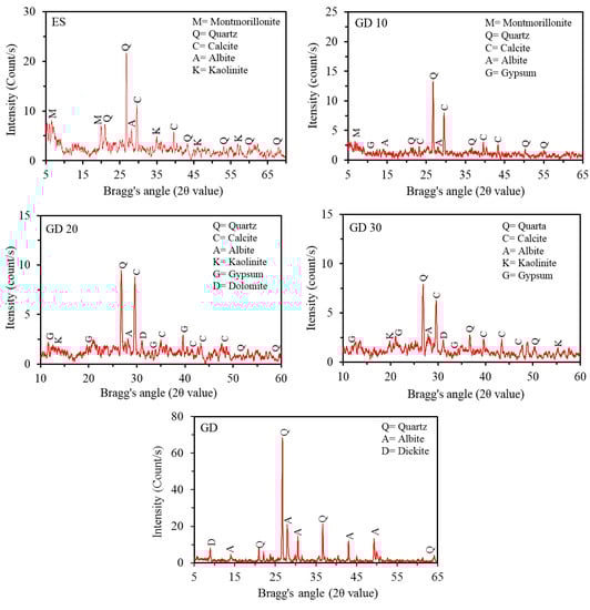 The alteration in the geotechnical properties of the ES can be related to its mineralogical alterations after the addition of GD. Figure 19 shows the XRD analysis of the ES and TES with concentrations of 10, 20, and 30% with a 28 day curing period. The XRD analyses of the ES-GD mixes are compared with the mineralogical analyses of the plain materials (ES and GD) in order to characterise the alterations in mineral composition after the modifier was added. It is observed that the mineral composition of the plain soil was quartz, kaolinite, and montmorillonite, which are clay minerals as well as non-clay minerals of calcite. The GD contains minerals, such as albite and quartz. The XRD pattern is clearly different from that of the plain soil, and additional reflections have been introduced. After GD modification, the reflection peak intensities of all clay minerals were reduced. This explains why the swelling of the stabilized soil has decreased (see Figure 17). Furthermore, when the GD content was increased to a specific level, the results showed a growth in calcite, with a weakening aluminium peak and the appearance of new mineral peaks, such as gypsum and dolomite in the stabilized soil, indicating the formation of a compacted soil matrix and, thereby, an optimum increase in strength. Similar findings were provided by Kalkan et al. []. However, compared to the specimens having soil + 10% GD and soil + 20% GD, the specimen including soil + 30% GD shows an increase in the peak of quartz and a drop in the peak of calcite, which could be major contributors to the deterioration of strength beyond 20% of GD (see Figure 11 and Figure 13).