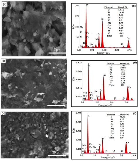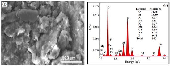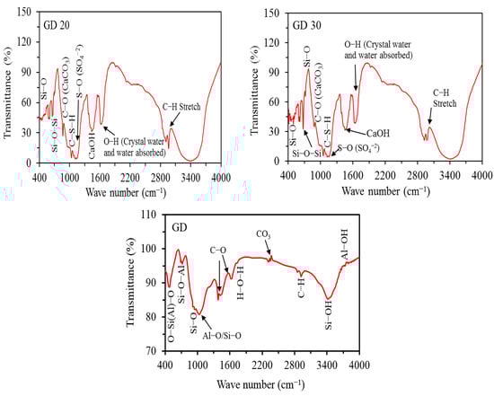 GD was obtained from the Shaq Al-Thouban district in South Cairo, Egypt. The GD was dried in an oven at 110 °C for 24 h to remove moisture, then pulverised repeatedly with a plastic hammer to remove any agglomeration. The particle size analysis of GD shows 8% clay, 33% silt, and 59% sand, as shown in Table 1. The liquid limit was 19.11% and the specific gravity was equal to 2.79. The compaction characteristics of GD show that the MDU and OMC are 19.7 kN/m3 and 10.3%, respectively. The XRD study of the GD showed the presence of albite and quartz as the predominant minerals (Figure 2b). The SEM image indicated that the granite particles have irregular shapes of different sizes (Figure 3c), whereas the EDAX analysis shows the presence of Si and Al with high ratios of 17.46% and 8.33%, respectively, and with minor contents of Na and Ca (Figure 3d). Figure 4b exhibits the FTIR spectrum of GD. The assignments were performed according to Aroke et al. [] and Medina et al. []. The peak at 1030.5 cm−1 can be attributed to characteristic bands of silicates, which are mostly related to stretching vibrations of Al-O or Si-O. Further, the peaks at 3400 and 3680 cm−1 are due to OH bond stretching for Si-OH and Al-OH. The bands at 949 and 690 cm−1, respectively, are an indication of the presence of quartz, and the band at 430 cm−1 was assigned to orthoclase and albite.