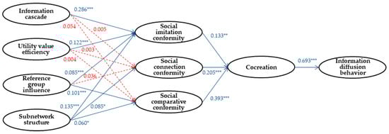 The results of this study are as follows. First, as a result of the path analysis between conformity appeal attributes and social conformity of beauty-focused one-person media, it was determined that information cascade significantly affected social imitation conformity (β = 0.286, CR = 11.598, p = 0.000), utility value efficiency significantly affected social imitation conformity (β = 0.122, CR = 5.588, p = 0.000), reference group influence significantly affected social imitation conformity (β = 0.085, CR = 3.836, p = 0.000), and subnetwork structure significantly affected social imitation conformity (β = 0.135, CR = 6.106, p = 0.000). Subnetwork structure significantly affected social connection conformity (β = 0.085, CR = 3.265, p = 0.011), but information cascade did not significantly affect social connection conformity (β = 0.005, CR = 0.170, p = 0.865), utility value efficiency did not significantly affect social connection conformity (β = 0.003, CR = 0.114, p = 0.909), and reference group influence did not significantly affect social connection conformity (β = 0.036, CR = 1.377, p = 0.169). Moreover, reference group influence significantly affected social comparative conformity (β = 0.101, CR = 3.732, p = 0.000), and subnetwork structure also significantly affected social comparative conformity (β = 0.060, CR = 2.210, p = 0.027), whereas information cascade did not significantly affect social comparative conformity (β = 0.054, CR = 1.768, p = 0.098), and utility value efficiency also did not significantly affect social comparative conformity (β = 0.004, CR = 0.151, p = 0.880). Second, as a result of the path analysis between social conformity and cocreation in beauty-focused one-person media, it was determined that social imitation conformity significantly affected cocreation (β = 0.133, CR = 2.863, p = 0.004), social connection conformity significantly affected cocreation (β = 0.205, CR = 4.584, p = 0.000), and social comparative conformity significantly affected cocreation (β = 0.393, CR = 9.665, p = 0.000). Third, as a result of the path analysis between cocreation and information diffusion behavior in beauty-focused one-person media, it was determined that cocreation significantly affected information diffusion behavior (β = 0.693, CR = 25.313, p = 0.000).