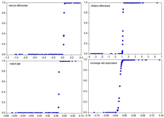 In the parameter estimation results in Table 7, the impact of the DC/EP on RMB internationalization is affected by the heterogeneity of the regime systems that are formed in particular, in the case of different transition variables, the impact of DC/EP on RMB internationalization is significant different, which reflects the significant asymmetric characteristics of the impact of DC/EP on RMB internationalization in a certain degree. It is worth noting that, the impact of core explanatory variable and control variables on RMB internationalization present significant nonlinear regime switching characteristics in the Figure 2, which demonstrates that the impact of DC/EP on RMB internationalization is significant regime heterogeneity once again, in other words, when Sino–U.S. interest differentials, inflationary gap, output gap, and exchange rate expectations are used as the transition variables. At the same time, Figure 2 shows that the impact of the DC/EP on RMB internationalization has a significant nonlinear regime heterogeneity. Specifically, first, when the interest differential is selected as the transition variable in a low-regime system, the impact of the DC/EP on RMB internationalization is 0.989, and the 1% significance level is significant, while, in a high-regime system, this impact is 0.018 (1.086–1.068), and is significantly positive at the 1% level. Therefore, combining the coefficients of the low-regime system and the high-regime system, the impact of the DC/EP on RMB internationalization was shown to be relatively large in the low-regime system (that is, the interest differential is less than 0.029), and, in both the low-regime system and the high-regime system, these coefficients are all significantly positive, indicating that when China’s monetary policy is tightened relative to the U.S. monetary policy, the DC/EP has a relatively small impact on the internationalization of the RMB. The potential economic implications of this result can be summarized as follows: when monetary policy shows a tightening trend, the central bank will tighten liquidity, the liquidity in the market will be reduced accordingly, and the breadth and depth of the use of the RMB will be reduced to a certain extent. In this context, the impact of digital currency on the internationalization of the RMB will be restrained. In addition, this tight monetary policy also leads to a short-term appreciation of the RMB exchange rate, which has an adverse impact on the export behavior of Chinese enterprises. At this time, the amount of money in current accounts will shrink, with a restraining effect on the internationalization of the RMB.