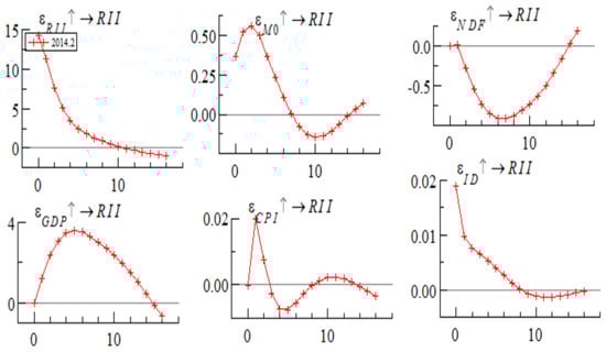 In addition, from the impact of the control variables on RMB internationalization, it can be seen that after the exchange rate expectations and inflation face positive shocks, the short-term response coefficient of RMB internationalization is negative, while the output gap and interest margin are positively affected, and the coefficient of the internationalization of the RMB is positive. The economic implications of the result can be summarized as follows. In the case of exchange rate depreciation and inflation, the process of RMB internationalization will be significantly inhibited. On the contrary, when China’s economy is in a growth trend and the RMB interest rate is higher than that of the US dollar, the internationalization of the RMB will be significantly promoted. The mechanism underlying the results is that, on the one hand, the increase in inflation and the depreciation of the exchange rate will lead to capital outflow, which will reduce the attractiveness of RMB assets, with a negative impact on the internationalization of the RMB. On the other hand, the central bank will also adopt a tightening monetary policy of raising interest rates and an intervention policy regarding the foreign exchange market to regulate inflation and the exchange rate, which will also affect the regulation of monetary policy, which is not conducive to the orderly promotion of RMB internationalization. Moreover, it should be pointed out that, with the gradual increase over time, the impact of all control variables on the internationalization of the RMB will change, which further implies that the impact of the control variables on RMB internationalization has the significant characteristic of maturity heterogeneity.