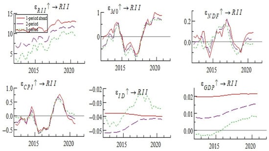 Table 1 shows the summary statistical results of all variables in the paper. The results show that the standard deviation of the RMB internationalization index (RII) is relatively large among the key economic and financial variables in this paper, which implies that the fluctuation range of RMB internationalization is much larger. This is also in line with the reality of the development of RMB internationalization. In comparison, the standard deviation of the DC/EP growth rate (M0) is only 2.981, which is the smallest standard deviation among all the variables involved in this paper, indicating that the DC/EP presents a very stable and gradual change trend, which is consistent with the realistic characteristics of DC/EP development in China. It should be pointed out that since the standard deviations of the Sino–U.S. interest differential (ID) and exchange rate expectation (NDF) are close, this further reflects on the consistent interconnected trend between Sino–U.S. interest differential and exchange rate expectations, and also reflects on the fact that the Sino–U.S. interest differentials will have an obvious impact on expectations to a certain extent. For the inflation (CPI) and output (GDP) gaps, the standard deviations are 3.037 and 3.133, respectively. The volatility of the inflation and output gaps is very similar, and thus implies that China’s economic growth and price changes are in line with the evolutionary characteristics of the economic cycle as a whole. It is worth noting that, from the estimation results of skewness, it can be seen that since the skewness of the DC/EP, exchange rate expectations, and output gap are all bigger than 0, this indicates that the DC/EP, exchange rate expectations, and output gap are all subject to a right-skewed distribution. On the contrary, the skewness of the variables of RMB internationalization, Sino–U.S. interest differential, and inflationary gap are all less than 0, indicating that RMB internationalization, Sino–U.S. interest differential and inflation gap are all subject to a left-skewed distribution.