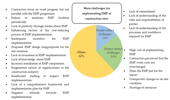 The eight main challenges can be grouped into two major components: people-related challenges and project-related challenges. These two components should be addressed to promote EMP implementation. The results demonstrate the need for a balanced allocation of commitments and responsibilities among all project stakeholders. The government can deploy initiatives contributing to effective EMP implementation. This can be done by providing instructions and guidelines to help project stakeholders understand and implement EMP effectively. Moreover, it is important to provide financial facilities, especially for contractors, to cover the costs incurred by using additional materials, machinery, and labor on the construction site.