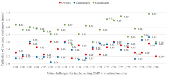 Table 6 and Figure 3 present the results of the agreement analysis of the main challenges between different project stakeholders, including owners, contractors, and consultants. The results show consistent views on the criticality of the following main challenges: CH17, CH28, and CH30. However, the criticalities were significantly different among project stakeholders for the following challenges: CH25, CH23, CH04, CH02, and CH01. These results indicate that most of the main challenges in EMP implementation are perceived differently by project stakeholders.