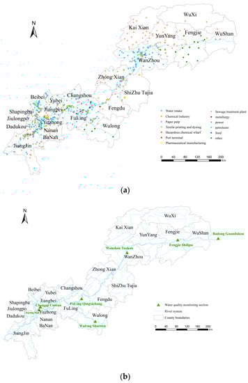 Based on the results of the special rectification work of the sewage outlets in the Yangtze River Basin in 2017, 289 large-scale sewage outlets in the Three Gorges Reservoir area were selected; the industry type, production scale, production process and other basic information of each sewage outlet unit were investigated, and the annual wastewater output of each enterprise’s sewage outlet were counted. Then, 379 non-agricultural water intakes were selected based on the survey data of water intakes from the 2012 water conservancy census; the annual maximum water intake, the number of people affected by water supply, and other basic information of each non-agricultural water intake were investigated in detail. The spatial distribution of sewage outlets and water intakes in the river section of the study area is shown in Figure 2a. We collected the monthly water quality monitoring data of important water quality monitoring sections of the trunk and tributaries of the Yangtze River (The blue line of Figures 2, 5 and 6) in Chongqing from 2017. The section location is shown in Figure 2b, and we collected the social, economic, population and other statistical data of administrative regions at all levels within the study area.