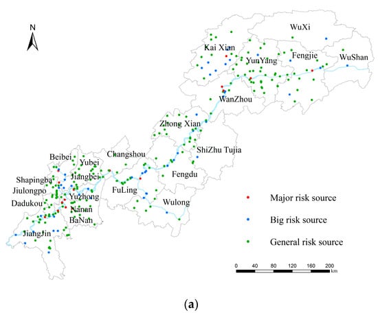 According to the grading standards of the water environment pollution risk evaluation index system, the risk sources, risk receptors, and the acceptable level of regional environmental risks were evaluated [32]. The risk sources in the study area were the sewage outlets of 289 key wastewater-producing enterprises, involving multiple industries. The annual total amount of wastewater produced by key pollution sources is about 1.45 billion tons. After evaluation, there were 14 major risk sources, 89 big risk sources, and 186 general risk sources. The spatial distribution of risk sources of different risk levels is detailed in Figure 5a. From the geographical distribution alone, Yunyang County had the largest number of risk sources with a total of 37, including 6 big risk sources and 31 general risk sources, but there were no major risk sources. There are a large number of industrial parks along the Yangtze River and Jialing River in the main urban area of Chongqing, which are the most intensive areas of high-risk pollution sources.