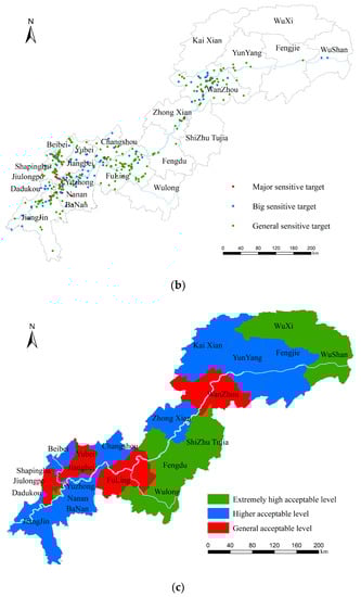 ③ The response layer corresponds to the acceptable level of regional environmental risk. It mainly reflects the objectively acceptable ability or subjectively willing acceptance of the environmental risk receptors for the losses and hazards they may suffer. This study mainly evaluates three indexes: the gross domestic product (GDP) of each county and district; the density of the population; and whether the area is within the scope of the rare fish reserve or not. Then, we divide the acceptable level of regional environmental risk into three levels: extremely high acceptable level; higher acceptable level; and general acceptable level.