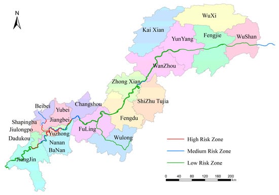 The comprehensive evaluation results of risk source dangerousness, risk receptor sensitivity, and regional environmental risk acceptable level of each county evaluation unit were statistically analyzed. According to Formula (7), the risk-zoning map of water environment pollution in the Chongqing section of the Three Gorges Reservoir area was drawn according to spatial statistics (Figure 7). It can be seen that:
