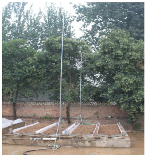 Simulations of rainfall were conducted using a transportable rainfall simulator, planned and constructed by the Institute of Soil and Water Conservation, Chinese Academy of Sciences (Yangling, Xianyang, Shaanxi Province, China). The device comprises a single water tank with a length, width and height of 2.0 m × 2.0 m × 1.5 m, pipes for supplying water (inner diameter of 48 mm), a water pump (2.2 kW), two side-spray nozzles, and two tripods (7 m high). Rainfall intensities of 30 and 120 mm h−1 were adjusted by altering the water pressure of the pipe water or by altering the nozzle size. Two tripods, each holding a nozzle, were placed 5 m away on the lower and upper sides of the soil box. The tripods were 7 m high to guarantee the raindrop fall velocity of almost the same as terminal velocity [30,31]. Rainfall kinetic energy, the average raindrop diameter, and the effective rainfall area were 27.0 J m2 mm−1, 2.33 mm, and 4 m × 5 m, respectively. The uniformity of rainfall was estimated to be >80%, using the Christiansen coefficient [32,33].