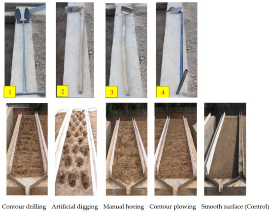 Tools for tilling (top) and corresponding runoff plots for different treatments (bottom) before simulated rainfall. (1) A lou is a traditional farming implement, which looks like a plow and is used for the preparation of the seedbeds of crop plants, such as sorghum, millet, and wheat. This implement comprises an iron handle, extending 1.6–1.7 m, and two toes that are 15 cm apart to form ridges and furrows. (2) A narrow hoe is another agricultural tool used to create shallow and narrow furrows and it consists of a wooden handle, with a length of 1.5–1.7 m, and a deep (20 cm) and narrow (9 cm) iron blade at the handle end. (3) A broad hoe is a tool employed for loosening soil, cultivating deep soil, and chopping weeds and it consists of an iron blade, with a depth and width of 10 cm and 18 cm, respectively, and a wooden handle, with a length of 1.5–1.7 m. (4) A plow is usually applied for breaking and turning over soil for seedbed preparation and consists of an iron handle, 1.5–1.7 m long, that terminates with an iron blade. Plow depth is 20 cm.