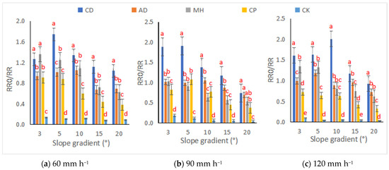 For a single tillage practice, the value of RR0/RR of CD was less than one, only if the conditions of the intensity of the rainfall and the gradient of the slope of 90 mm/h and 20°, and of 120 mm/h and 20°, were met, respectively. Similarly, the tillage practices of MH and CP had similar change rules, but the required conditions of rainfall intensity and slope gradient for the case of RR0/RR > 1 were lower than those of CD, while for AD, the value of RR0/RR was not significantly greater than one.