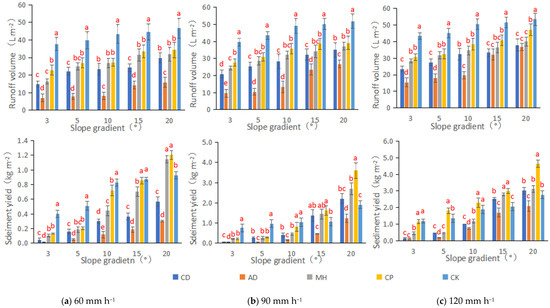 Volume of runoff and yield of sediment under different tillage practices. CD, contour drilling; AD, artificial digging; MH, manual hoeing; CP, contour plowing; and CK, smooth surface (control). Values for various tillage practices under each slope gradient denoted with different letters (a–e) were very different at p < 0.05, according to LSD test.
