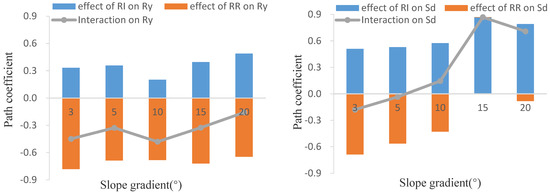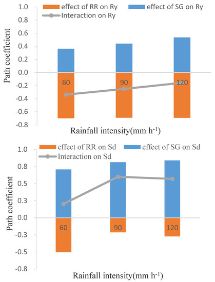 According to the path analysis results (Figure 6), slope gradient had a positive effect on the Ry and Sd, while surface roughness had a negative effect on the Ry and Sd. The interactive effect between the two factors was inconsistent. There was a negative interactive effect on the Ry: the slope gradient effect on runoff increase was lower than that of surface roughness on runoff reduction. This interactive effect on the Ry was weakened under higher rainfall intensities. Conversely, the interaction between the two factors had a positive effect on the Sd.